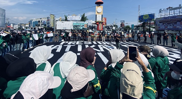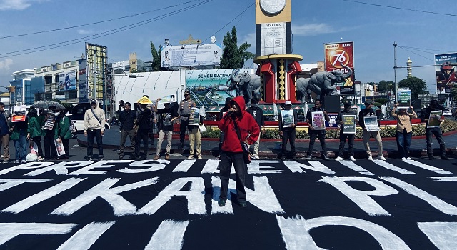 Puluhan orang mengitarinya. Sebagian mengangkat poster di atas kepala, sebagian lain menggenggamnya di dada. Mereka datang dari Bengkulu, Sumatra Utara, Sumatra Barat, Jambi, Sumatra Selatan, Lampung, hingga Aceh—membawa cerita berbeda, dengan kegelisahan yang sama.