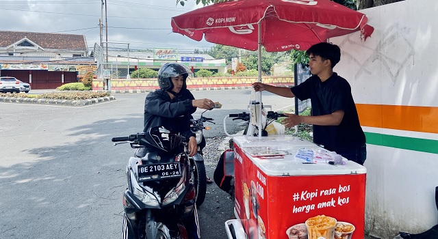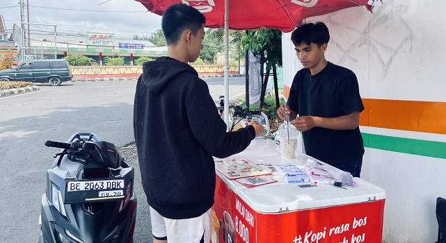 Di pinggir trotoar sebuah kampus, sebuah motor listrik yang telah dimodifikasi menjadi gerobak kopi terparkir. Di sampingnya, Riski Ramadhan menjaga dagangannya. Di dalam gerobak, aneka varian kopi dan deretan cangkir plastik tersusun rapi. Aroma kopi gula aren sesekali tercium ketika ia membuka tutup wadah.
