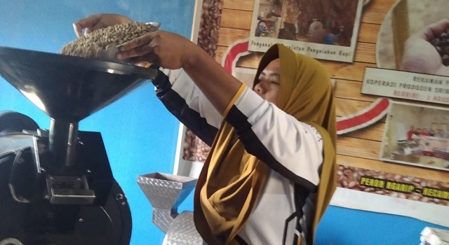 Di sudut lain, para perempuan memasukkan kopi ke mesin giling. Bunyinya menderu. Mereka mengemasnya dalam plastik ‘Kopi Srikandi’. Di bawah lereng, rumah-rumah kayu berdiri kaku menghadap kebun kopi yang basah. Inilah Ulubelu.